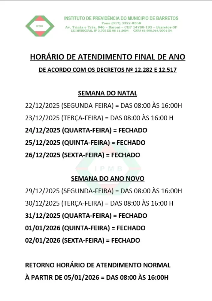 Holerite Prova de vida Portal da transparência Legislação Notícias Ouvidoria Cartilhas Conselhos Anterior Próximo Notícias Pesquisar notícias HORÁRIO DE ATENDIMENTO FINAL DE ANO Ver a notícia Comunicado de combate ao assédio moral e sexual Ver a notícia Telefone temporariamente fora do ar, entre em contato pelo número (17) 98142-2416. Ver a notícia Informe de Rendimentos para Declaração de Imposto de Renda de 2025. Ver a notícia Instituto de Previdência informa sobre adequação na folha de pagamento Ver a notícia Alerta de golpe Ver a notícia Todas as notícias